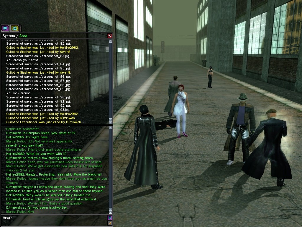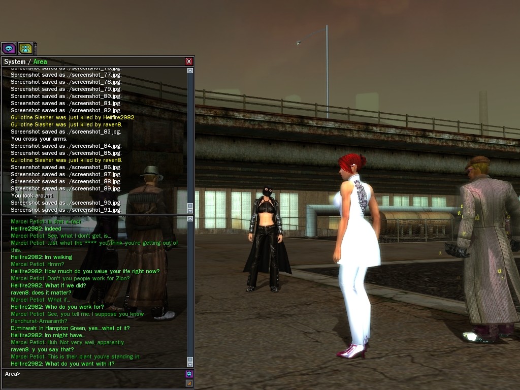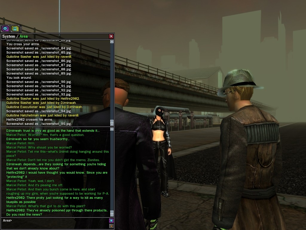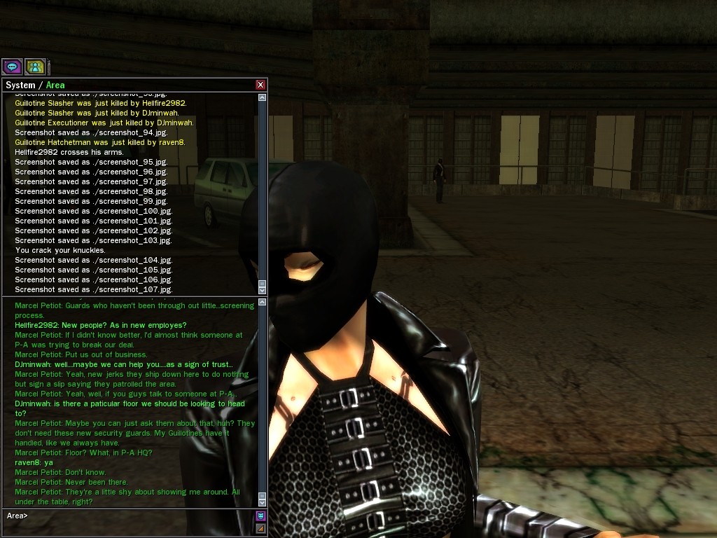 For General Distribution to All Zion Operatives Warriors of the Eternal Alliance faction, responding to an alert of unusual levels of Guillotine gang activity around Pendhurst-Amaranth's plant in Southard, were accosted by the gang's masked leader. She told them that the gang provides security services for Pendhurst-Amaranth's facility in an unofficial capacity, but that this work had been disturbed of late by an influx of new P-A security members. It is unclear what, if anything, this may signify. Operatives are cautioned to keep in mind that the statements of the city's Exile street gangs are often misleading.