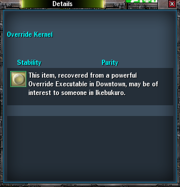 Store Inventory: SSR Shades: 150 mil each Raedar Earpieces: 10 mil each Dernick Earpices: 8 mil each SSR Gum: 1 mil each Elite Commando Gear: 25 mil each, or 130m for full set. Quicksilver Gloves (or frags @ 3.5x price, if you prefer): 35 mil each Overdrive Bandana (or frags @ 3.5x price, if you prefer): 75 mil each Dungeon Boss Gear (Trolls, Emmas, Dragonskin, Direwolf, w/e): 25 mil each Shadow Phoenix Pills: 11 mil each. I am willing to trade 1:1 for the Zion and Merv pills. Smith Rage Pills: 5 mil each. Area K: 80 mil each. 10 Fingers: 50 mil (one pair left). Sleepwalker Stage 3 Signature: 20 mil each Sleepwalker Stage 3 Marbles: 2 mil each Sleepwalker Stage 3 Item: 60 mil each Override Kernel: 150 mil Override Shells: 10 mil each Kunoichi GM Token: 55 mil each Kunoichi GM Shuriken: 4.5 mil each Kunoichi GM Item: 215 mil each Sakura Dana: 40 mil Sakura Mask: 25 mil WM Lenses/Shades: 25 mil Armored/Shielded level 50 items (see list): 10 mil each, or 5 mil + Clothing Subroutine. NOTE: I decomp everything I farm, and typing up lists is a pain in the behind. That list hasn't been updated in a long time, so if you're looking for something, tis best to just ask and I'll check my codestructs for it. Random Stuff: