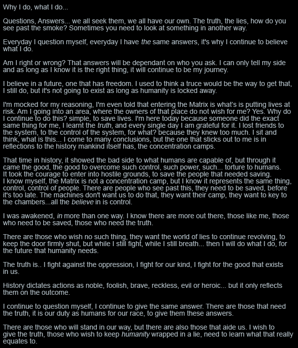 We have fought for Zion for many years, we have served her for humanity and for what we believed in to be a just cause. Our cause, our beliefs have not changed in the slightest, but we now know what must be done to achieve our goals, therefore we would like to announce that from this day forward we will be assisting the machines with their goals and using that to help continue to fight for that what matters most to us. /formalbow