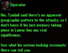 Aquatium Hello Zebra, now let see if we can find out some more intel, what do you remember? Zebra Thanks for coming. The others don't want to talk to me now... They treat me like a stranger. Sorry. The last thing I remember... There isn't much. I was in Camon, about a year ago, trying to keep the Slashers under control. They'd been causing trouble again... I remember searching the back alleys... I saw an Agent standing in a doorway, just watching me--not that I expected him to help. I was... I think I must have been having trouble finding Slashers... The alleys were so quiet...That's all. After that it's blank, except for a feeling of being...lost, I guess. Aquatium An Agent... now that is interesting, something new, I will look into it further, thank you.
