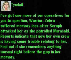 Bauersfelda At first I thought he was lucky--meeting Seraph after only just getting back into the Matrix--but he doesn't remember any of it! Talk about irony... Acrab I don't know what happened... Last thing I really remember before I woke up in Zion a few days was going to investigate one of our terminals in Lamar that had stopped responding. I was on my way there, and then...nothing. That was months ago, now. Coming back into the Matrix doesn't seem to be helping me remember any of it. Gnu Acrab was out of contact for several days on that mission. When we finally tracked down his signal, he was at a nearby restaurant, eating a steak dinner, perfectly calm--didn't remember the mission he was supposed to be on, barely even remembered us, except our names and rank. They put him under observation in Zion for a while, but he seemed fine, if a little pre-occupied. They wanted to put him back on active duty, but he protested: said he didn't feel like he could count on himself in a life-or-death situation. He asked for extended sick leave in Zion, and they gave it to him. But we need experienced soldiers in the field, and he seemed healthy; after four months they revoked his leave, and put him back with us on active duty. Then Seraph ran into him. Aquatium investigating a terminal and then bam, memory loss and personality change, almost like someone else was now in control of them. Its clear something happened, maybe an attack of some sorts, but from what or who.