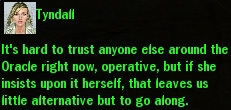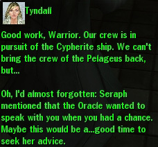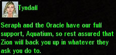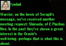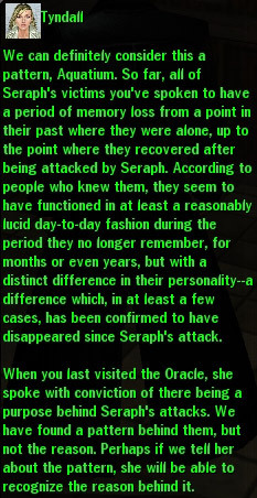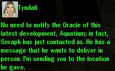 Aquatium Oracle.. we have seen Seraph, but he had very little to say, however he did indicate he did have a real purpose to this. The Oracle Yes. Thank you for telling me that, dear; it does explain some things. I've felt that Seraph's getting closer to his goal. There's something very important he has left to do, only it won't work out quite like he thinks. Aquatium I hope things will be for the better.. The Oracle But then, nothing ever goes perfectly, does it? Doesn't keep us from trying, though--and I suppose that's what really gets us out of bed in the morning. Aquatium Quite so Oracle, we do what we can and what we must.