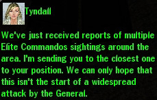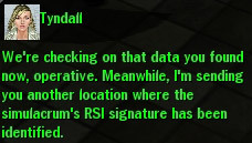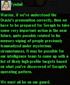 Seraph Your assistance is most welcome. Although I cannot see Sati's trail at this time, it is my hope that pursuing those I can see will bring us closer to her. So, we begin by searching for some of the General's commandos. Although we travel by different means, our paths will bring us together. The Oracle I am a little worried about Sati--she's never been away for this long before--but she's a tough kid; I think she'll pull through all right. If you really want to know, I'd say it's the General who's going to end up in a bad way if he doesn't change his tune. Aquatium We will all do what we can to bring her back safe and deal with The General. Seraph Your operator will guide you. Aquatium I left and recieved the locations I had to go to.
