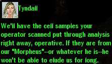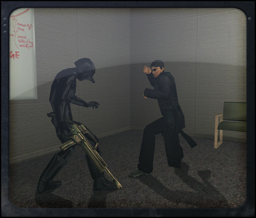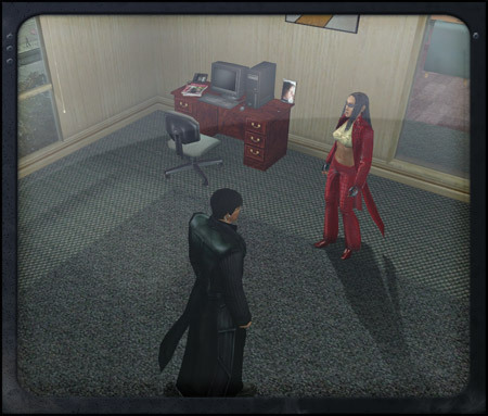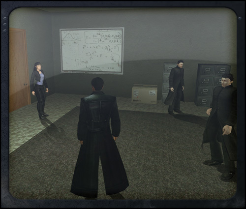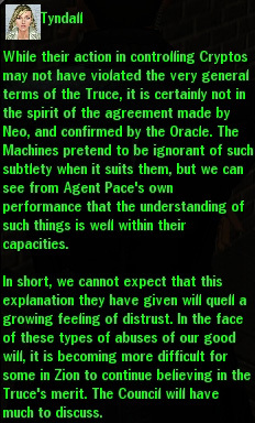 Agent Wong The Zion operative has arrived. Agent Pace Saluti, rossapillola. Of course, we are very concerned about these recent events, and we welcome the opportunity to clarify them for you. It goes almost without saying that we do not have either Morpheus or Neo in captivity, as has been alleged--allegations made with absolutely no supporting evidence, I might add. Those two men were, unfortunately, terminated by powerful rogue programs quite some time ago, as everyone knows. Secondariamente, concerning Cryptos, we must point out that overwriting of individual humans for security purposes is not prohibited by the agreed-upon Truce. We will continue to take what actions we deem necessary to ensure the continued stability of the System, and the safety of its inhabitants. Aquatium Well.. thank you, for that explination. Agent Pace Grazie, operatore. I am also authorized to inform you that our campaign against the exiled program The General continues to make good progress, despite support he has recently received from the Merovingian. We expect to eliminate the General and his Sentinel commandos as a threat in the near future. Aquatium I hope we hear more good news on that front, sooner rather than later, it is a threat concerning us all. I left the meeting and updated Tyndall.