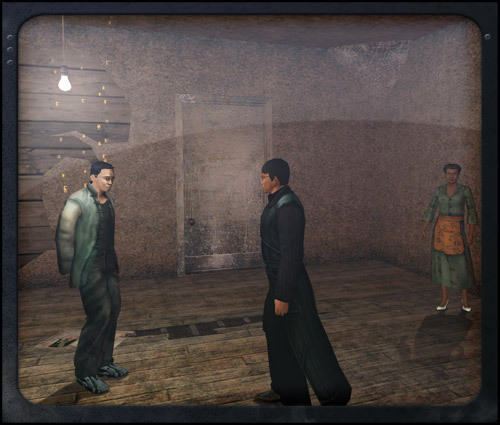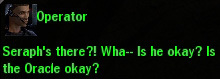The Oracle Well, look who showed up, huh? He's a little mussed from that dunking they gave him, but that's still my Seraph. Aquatium I am releaved to see him back at your side Oracle. The Oracle Aw, I'm glad to see you both. Now, who wants a hug? Aquatium I could use a cookie. Seraph All is in its proper place now. Apologies for my late arrival. Thank you for protecting the Oracle. I do not understand it, but...in the river, I felt code flowing through me. Everything went dark... Much time must have passed. I felt myself rising. I came to the surface, and pulled myself out. There were people there... I realized that I could...see a foreign presence in one of their minds--a Machine program. And I could reach it--pull it out. It has been much work, but I have removed all such programs I could find in the city. Aquatium Well... then I'm sorry if anyone doubted what you were doing Seraph. After we heard what happened at the river, and then what the Merovingian was saying, we feared the worst. The Oracle Seraph's a tough cookie; he's been around a long time, you know. Yeah, the cheat codes in that river did a number on him, but I have a feeling he'll be all right. Ooh, but come to that, what am I standing around jawing for? I've got cookies to bake. Seraph I know that...my mind has been clouded. I feel it begin to clear at last. Perhaps the effects of the code are wearing off. I must remain, and protect the Oracle. Aquatium Good to hear. We all know she is back in safe hands.
