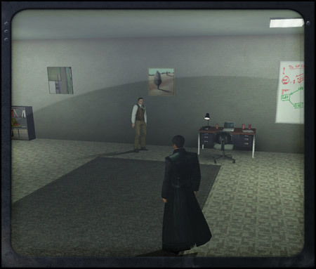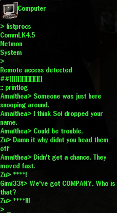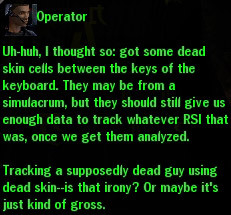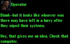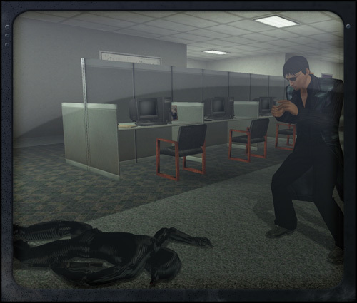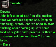 Aquatium The main computer to search was locked and required an access key, didn't take me long to get that. Security Yah, yah, keep up the good work... Bluepill Hmm dee dmm... Do you know who I am... Because I don't know myself... Hm hm-mm hmm... Colin Lange Something's wrong with my computer. It won't give me access! How am I supposed to finish that report? Where's IS when you need them? I swear that Dewey hides from me... Dewey Hoyos I've got like fifty billion things I'm working on right now. We've got an online work request system, you know. Use it. Aquatium Sure thing..., the information from some of the computers was certainly... interesting.