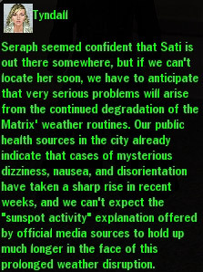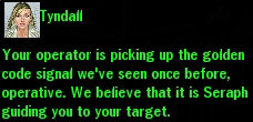 // Transmission Log Entered Aquatium Seraph was still running around the megacity, Sati still kidnapped, things were still in the sky. I was trying to make sense of it all, trying to find a reason, the why... the what..., I was hoping the answers were coming closer, I could just see it. We know Seraph was attacking people who seemingly have undergone a change in character, and then when Tyndall was in contact, the news she gave came to no suprise.