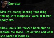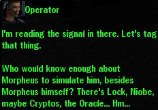 Ghost It may be disappointing, but we have to face the fact that this "Morpheus" we've been encountering is almost certainly a fake. The signal is picking up, and we should have the coordinates soon. I need you to position yourself close to it so we can initiate a trace routine. If we're fast enough, maybe we can get a trace all the way back to its origin point in the city. Aquatium Got it, let's hope we can lead it back to who is transmitting these signals.