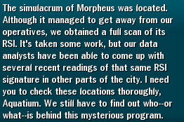 // Transmission Log Entered Aquatium Finally, the city was back to normal, so to speak. The skies were normal once more. Sati was safe again, and the General on the run. Another matter was still to be dealth with, these "Morpheus" sightings. The truth behind them was still unclear, but it was time to pres on the matter and find the truth.