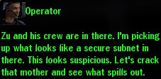 Aquatium Affirmative. I arrived to meet Seraph and The Orcale, and overheard some interesting chatter. Zion Upgrade Artist What do you think the Machines are going to do with Cryptos now that Seraph "outed" him? Do they really want damaged goods on their hands. If they really intended to try patching things up, they'd hand him back over to Zion... Zion Karate Grandmaster I don't know what the Merv is thinking throwing in with that dope, the General, but I enjoy staking vampires at least as much as I do stomping on the General's goose-steppers, so you won't hear me complaining. Zion Physician Oh, yeah, there's big stuff going on back home. Uh... You didn't hear that from me, though. Aquatium Big stuff... I was keen to learn more, but not right now.