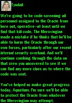 Aquatium We need answers Tyndall, this is not what the truce is about. Sati's return is still a main concern, we need to concentrate on that also, keep me posted. // Transmission Log End