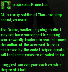 Holographic Projection Congratulations. This is what is called "a diversion." By the time you hear this message, my commandos will already be storming the Oracle's apartment in Mara. End transmission. Aquatium *CENSORED*, son-of-a...