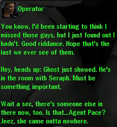 Aquatium I recieved the next location, and made my way. Upon arrival I noticed 1 computer online and I hacked into the last used records. As soon as I took the data, Elite commandos were upon me. After killing the few left, I again came across Seraph.