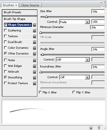 Step 5 Using the Brush options > Shape dynamics I add the fade to this brush, you might need to adjust the angle to make sure it shapes correctly. On the image I painted in to show how the brush is working. You then use this bigger brush to add to the hair shape you have been forming.