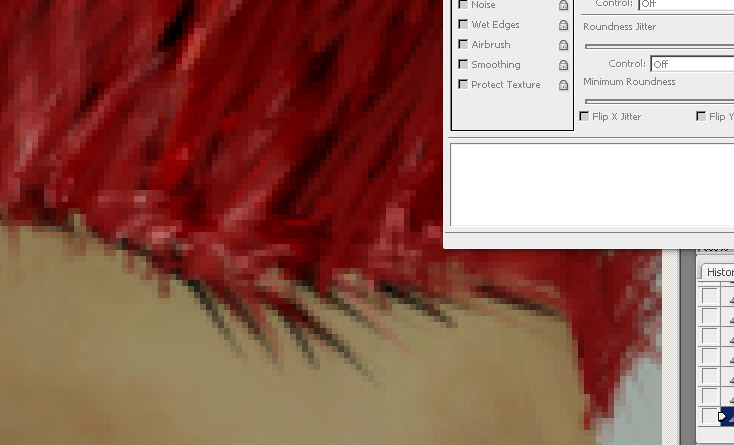 Step 3 First thing I'll do is get my base color for the hair, in this case it's red. Next you need to start brushing in the base of the hair. As shown below use the brush options, apply shape dynamics and control: Fade. This is the key to the full edit, you also adjust the size of the fade based on the hair you are painting in and where it is placed.